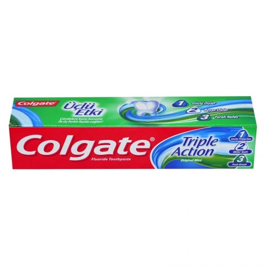 خمیردندان سه کاره کلگیت Colgate Triple Action حاوی فلوراید و نعناع بوده و دارای سه عملکرد ضدپوسیدگی، سفیدکننده و تازگی بخش تنفس می باشد.